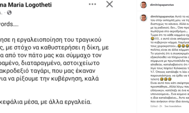 Όλα ξεκίνησαν από μία ανάρτηση που έκανε την Κυριακή (31.08.2025) η Άννα Μαρία Λογοθέτη στο Facebook και προκάλεσε την οργή του γνωστού δημοσιογράφου. Έτσι ο Δημήτρης Παπανώτας απάντησε δημοσίως, ενώ το ίδιο έκανε στη συνέχεια και εκείνη…