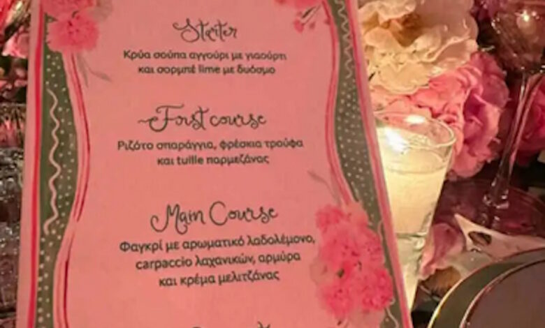 Από αναρτήσεις που έγιναν στα social media, είδαμε και το μενού που είχε επιλέξει το ζευγάρι για τον τραπέζι στον γάμο του, το οποίο ήταν λιτό αλλά με ιδιαίτερα γεύσεις. Το μενού λοιπόν που προσφέρθηκε ήταν ιδιαίτερα εκλεπτυσμένο και ισορροπημένο, περιλαμβάνοντας τα εξής πιάτα. Ορεκτικό: Κρύα σούπα αγγουριού με γιαούρτι και σορμπέ lime με δυόσμο. Πρώτο Πιάτο: Ριζότο σπαράγγια, φρέσκια τρούφα και tuile παρμεζάνας.