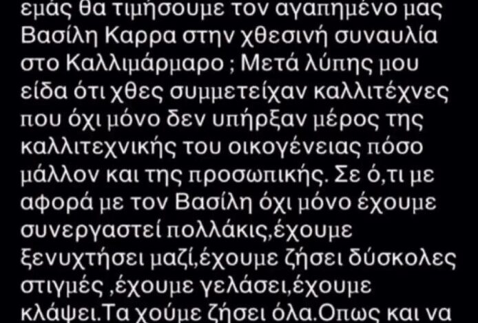 «Ποιοι αλήθεια αποφάσισαν ποιοι από εμάς θα τιμήσουμε τον αγαπημένο μας Βασίλη Καρρά στη χθεσινή συναυλία στο Καλλιμάρμαρο; Μετά λύπης μου είδα ότι συμμετείχαν καλλιτέχνες που όχι μόνο δεν υπήρξαν μέρος της καλλιτεχνικής του οικογένειας, πόσο μάλλον της προσωπικής», γράφει.