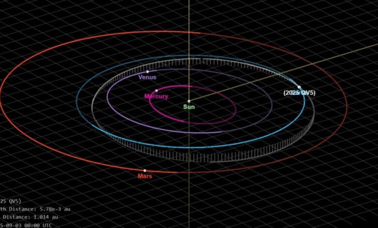 Η τροχιά του 2025 QV5 γύρω από τον Ήλιο τον φέρνει κοντά στη Γη και την Αφροδίτη. Για το μεγαλύτερο μέρος του επόμενου αιώνα, ο αστεροειδής θα περνάει πιο συχνά κοντά από την Αφροδίτη