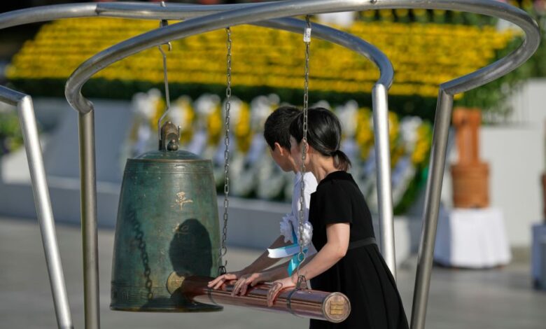 Νεαροί χτυπούν μια καμπάνα κατά τη διάρκεια της τελετής για την 80ή επέτειο του βομβαρδισμού στο Πάρκο Μνημείου Ειρήνης της Χιροσίμα στη Χιροσίμα