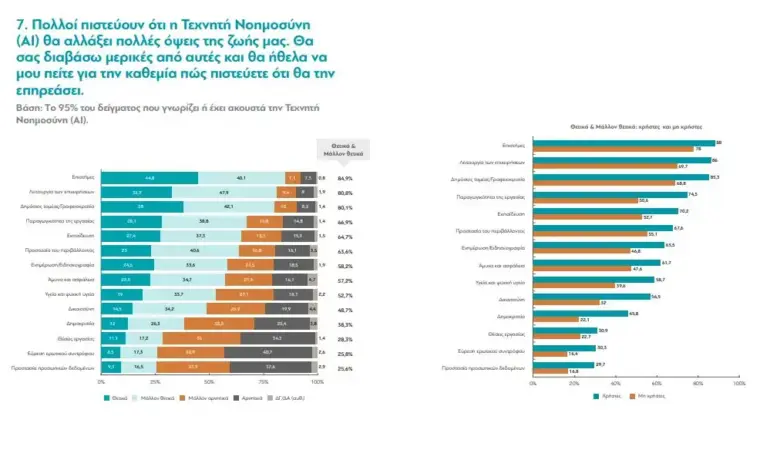 Σύμφωνα με μια ανάλυση τον αποτελεσμάτων από τον κοινωνιολόγο, μεταδιδακτορικό ερευνητή στο ΕΑΠ και διδάσκοντα στο ΕΚΠΑ, Ηρακλή Βογιατζή, η εμπιστοσύνη των Ελλήνων στην ΤΝ παρουσιάζει διακυμάνσεις ανάλογα με τις περιοχές εφαρμογής της και το πόσο υψηλό θα είναι το κόστος σε περίπτωση λάθους.