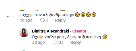 Ωστόσο, αυτή η ερώτηση φαίνεται ότι δεν άρεσε και πολύ στη Δήμητρα Αλεξανδράκη, η οποία χωρίς να αποκαλύψει τον λόγο που αποφάσισε να ρίξει δημοσίως ένα «καρφί» για τον Δημήτρη Αλεξάνδρου, απάντησε λακωνικά στη δικαδικτυακή της φίλη: «Όχι ψυχούλα μου, δεν είμαι ξεπεσμένη».