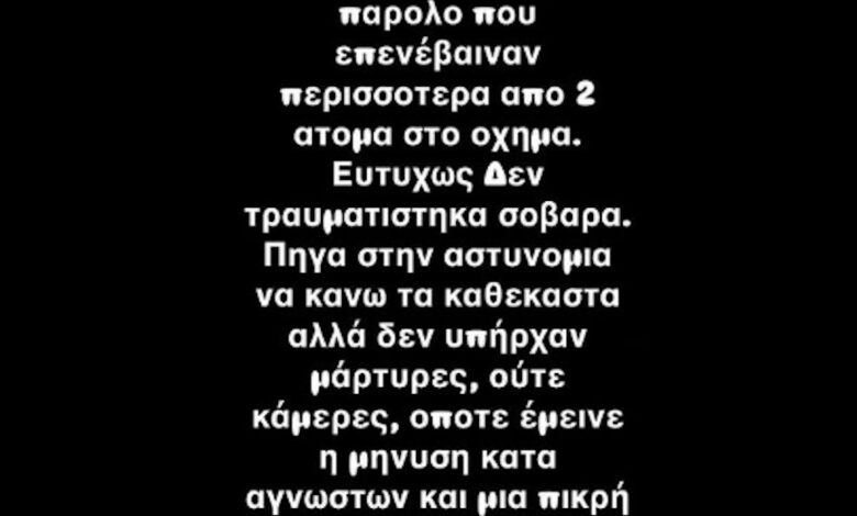 Ευτυχώς δεν τραυματίστηκα σοβαρά. Πήγα στην αστυνομία να κάνω τα καθέκαστα αλλά δεν υπήρχαν μάρτυρες, ούτε κάμερες, οπότε έμεινε η μήνυση κατά αγνώστων και μια πικρή υπενθύμιση ότι η ανθρωπιά είναι πολύτιμη και δυστυχώς σπάνια.