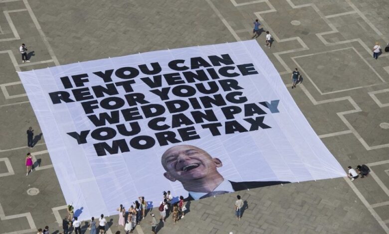 Πριν φτάσει καν ο Μπέζος με τη σύζυγό του στη Βενετία οι κάτοικοι είχαν αρχίσει τις διαμαρτυρίες. Άπλωσαν μάλιστα και ένα πανό στο κέντρο της πόλης που έλεγε «Αν μπορείς να νοικιάσεις τη Βενετία, τότε μπορεί να πληρώσεις και περισσότερους φόρους», ένα καρφί για τη χαμηλή φορολόγηση των δισεκατομμυριούχων, κάτι για το οποίο έχουν αντιδράσει ακόμα και πάμπλουτοι, όπως ο Γουόρεν Μπάφετ.
