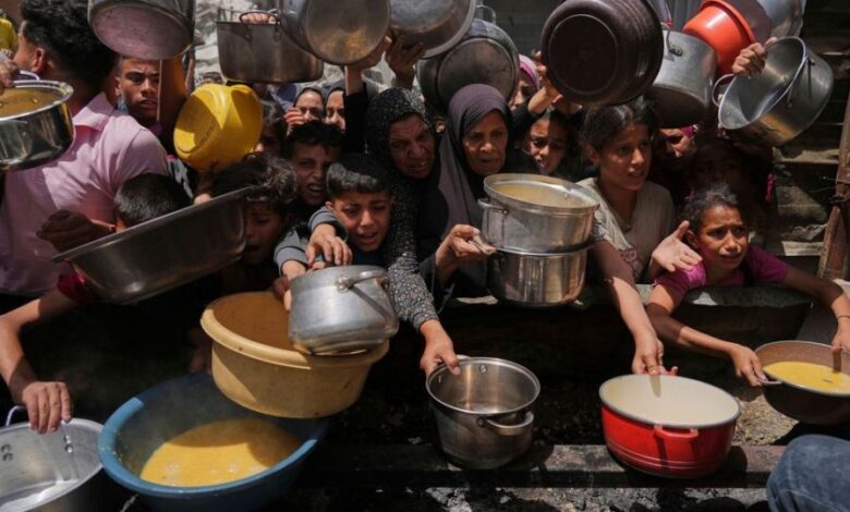 Παλαιστίνιοι αγωνίζονται να λάβουν τροφή σε μια κοινοτική κουζίνα στην Τζαμπάλια, στη βόρεια Λωρίδα της Γάζας