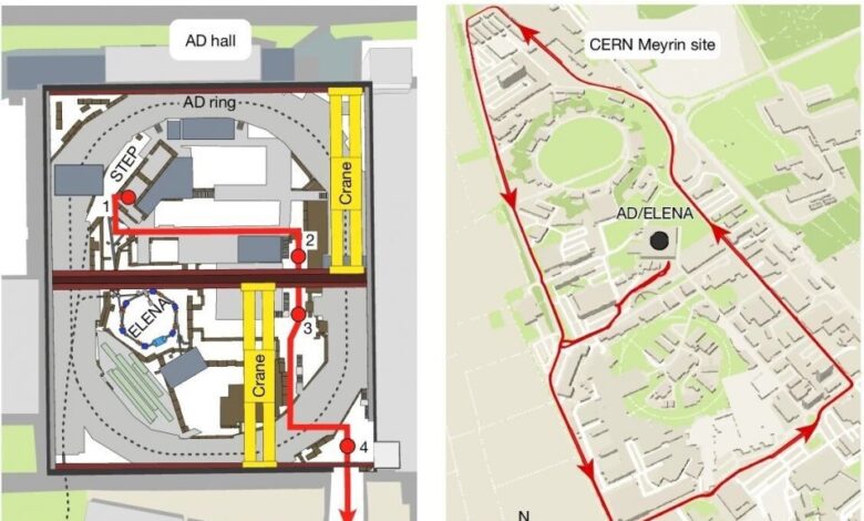 Ο χάρης της διαδρομής που ακολούθησε η αντιύλη εντός του εργοστασίου παραγωγής της (a) και των εγκαταστάσεων του CERN στο Meyrin (b)