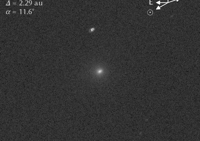 Η πιο πρόσφατη εικόνα του 3I/ATLAS (στο κέντρο) που καταγράφηκε στις 31 Οκτωβρίου. Το σώμα πιο πάνω είναι άστρο που εμφανίζεται παραμορφωμένο εξαιτίας της κίνησης του κομήτη