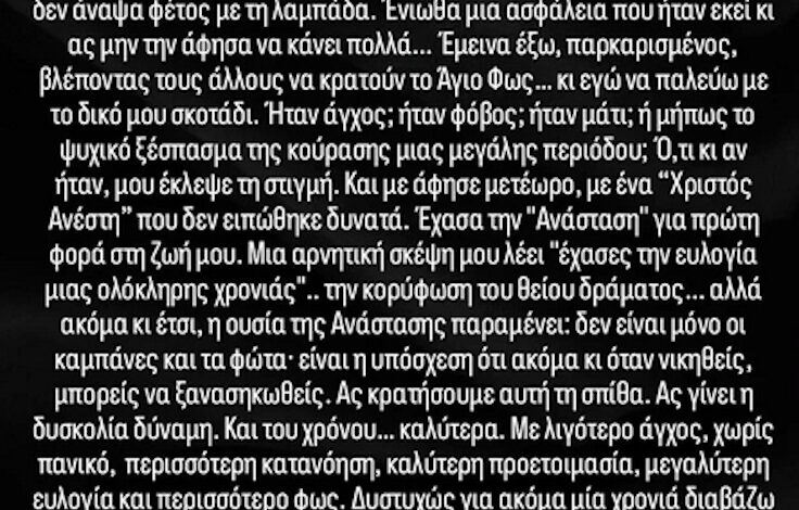 Ό,τι κι αν ήταν, μου έκλεψε τη στιγμή. Και με άφησε μετέωρο, με ένα “Χριστός Ανέστη” που δεν ειπώθηκε δυνατά. Έχασα την Ανάσταση για πρώτη φορά στη ζωή μου. Ας γίνει η δυσκολία δύναμη. Και του χρόνου… καλύτερα.