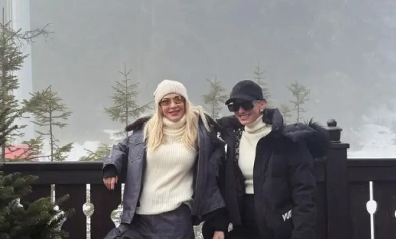 Σε ένα από τα στιγμιότυπα φαίνεται να ποζάρει με φόντο το χιονισμένο τοπίο και τα έλατα, ενώ σε μια άλλη φωτογραφίζεται καθισμένη σε μια πολυθρόνα.