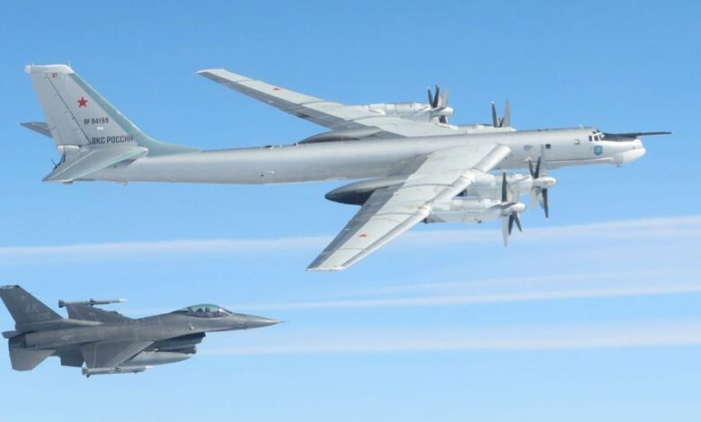 Το μαχητικό αεροσκάφος F-16 της Πολεμικής Αεροπορίας των ΗΠΑ, αναγνωρίζει και αναχαιτίζει ένα ρωσικό στρατιωτικό αεροσκάφος Tu-95.