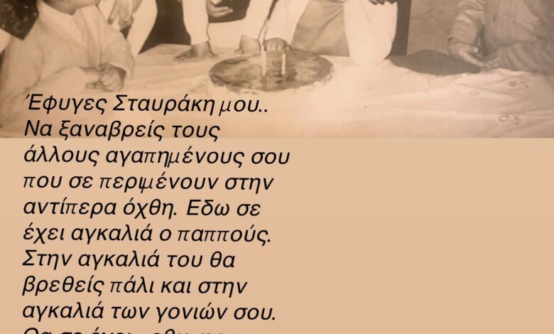 «Έφυγες Σταυράκη μου. Να ξαναβρείς τους άλλους αγαπημένους σου που σε περιμένουν στην αντίπερα όχθη. Εδώ σε έχει αγκαλιά ο παππούς. Στην αγκαλιά του θα βρεθείς πάλι και στην αγκαλιά των γονιών σου. Θα σε έχει πεθυμήσει η μάνα σου. Ήσουν ο πιο μεγάλος μας. Το πρότυπό μας. Ο καβαλιέρος μου στους χορούς. Ο πρώτος μας ξάδερφος. Αδερφός μας.