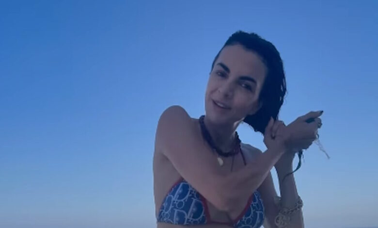 Στη νέα ανάρτηση που έκανε στον προσωπικό της λογαριασμό στο Instagram τη Δευτέρα (04.08.2025), η «εκρηκτική» ηθοποιός δημοσίευσε μία σειρά φωτογραφιών της όπου ποζάρει στο νερό, με το μπικίνι της και ένα άσπρο μπλουζάκι που έχει δεμένο στη μέση της.