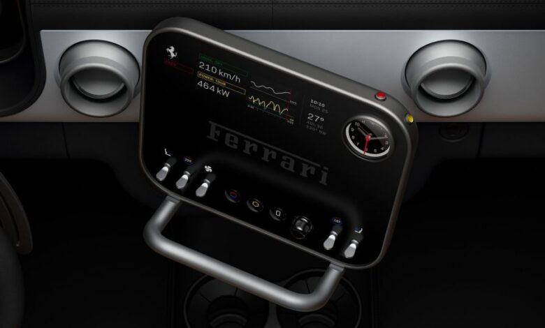 Στην κεντρική κονσόλα, μια περιστρεφόμενη οθόνη 10 ιντσών θυμίζει περισσότερο premium συσκευή τεχνολογίας παρά παραδοσιακό σύστημα infotainment, ενισχύοντας τη διαφορετική προσέγγιση που θέλει να υιοθετήσει η Ferrari.