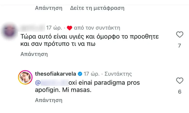 Ανάμεσα στα σχόλια που δέχτηκε η ίδια απάντησε σε χρήστη του instagram που της έγραψε: «Τώρα αυτό είναι υγιές και όμορφο το προωθείτε και σαν πρότυπο τι να πω». Η Σοφία Καρβέλα απάντησε: «Όχι, είναι παράδειγμα προς αποφυγή, μη μασάς».
