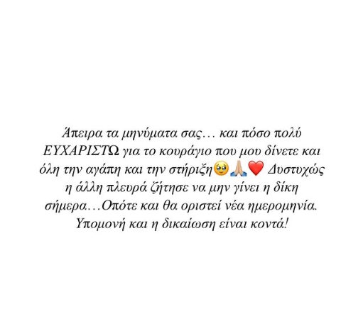 «Άπειρα τα μηνύματά σας… και πόσο πολύ ευχαριστώ για το κουράγιο που μου δίνετε και όλη την αγάπη και την στήριξη. Δυστυχώς η άλλη πλευρά ζήτησε να μην γίνει η δίκη σήμερα… Οπότε και θα οριστεί νέα ημερομηνία. Υπομονή και η δικαίωση είναι κοντά», έγραψε η γνωστή influencer στη δημοσίευση που έκανε στο Instagram της, θέλοντας να εκφράσει την ευγνωμοσύνη της στους ανθρώπους που αυτές τις δύσκολες στιγμές βρίσκονται στο πλευρό της.