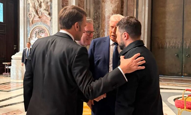 Από αριστερά προς τα δεξιά Μακρόν, Στάρμερ, Τραμπ και Ζελένσκι στο περιθώριο της κηδείας του πάπα Φραγκίσκου