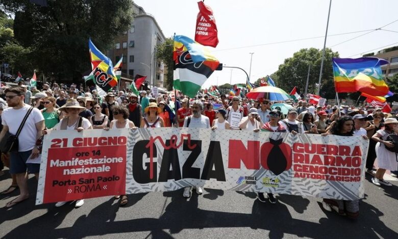 Μέλη και στελέχη των Πέντε Αστέρων, της Ιταλικής Αριστεράς, ιταλικών συνδέσμων και κινημάτων συμμετείχαν, το απόγευμα του Σαββάτου (21/6) στην Ρώμη σε κινητοποίηση κατα του εξοπλισμού της Ευρώπης και των ισραηλινών βομβαρδισμών στη Γάζα.