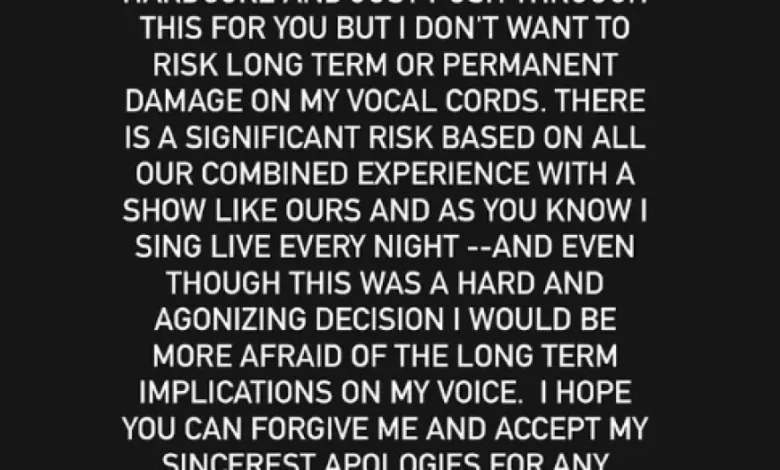 «Υπάρχει ένα σημαντικό ρίσκο με βάση όλη τη συνδυασμένη εμπειρία μας με μια παράσταση σαν τη δική μας και όπως γνωρίζετε τραγουδάω ζωντανά κάθε βράδυ. Φροντίζω πολύ τον εαυτό μου για να μπορέσω να παρουσιάσω αυτό το εξαιρετικά απαιτητικό σόου. Αγαπώ πολύ τους θαυμαστές μου, σας σέβομαι και ελπίζω να δεχτείτε την ειλικρινή μου συγγνώμη», κατέληξε στην ανάρτησή της, καθησυχάζοντας τους θαυμαστές ότι «προσπαθούσε να επαναπρογραμματίσει το σόου το συντομότερο δυνατό».