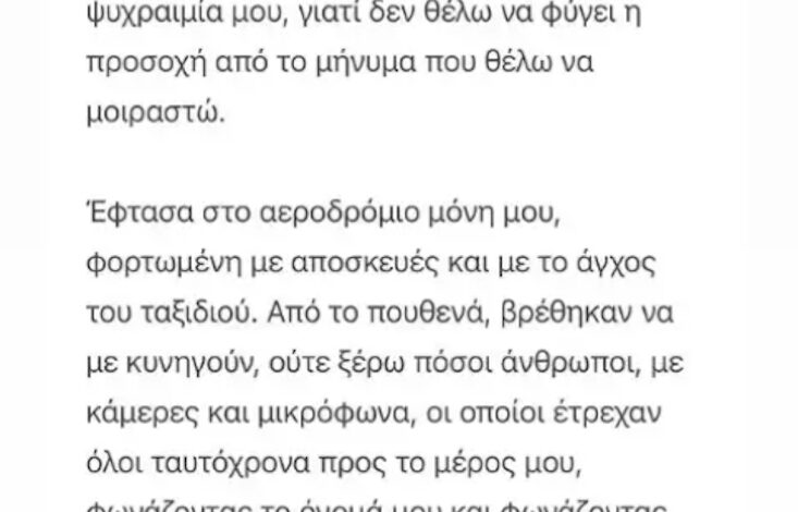 «Έφτασα στο αεροδρόμιο μόνη μου, φορτωμένη με αποσκευές και με το άγχος του ταξιδιού. Από το πουθενά, βρέθηκαν να με κυνηγούν, ούτε ξέρω πόσοι άνθρωποι, με κάμερες και μικρόφωνα, οι οποίοι έτρεχαν όλοι ταυτόχρονα προς το μέρος μου, φωνάζοντας το όνομά μου και φωνάζοντας προς το μέρος μου κάθε είδους ερώτηση», αναφέρει, μεταξύ άλλων, η Μαρίνα Σάττι στην πρώτη από τις αναρτήσεις που έκανε, πριν ακόμα βγουν στη δημοσιότητα τα βίντεο.
