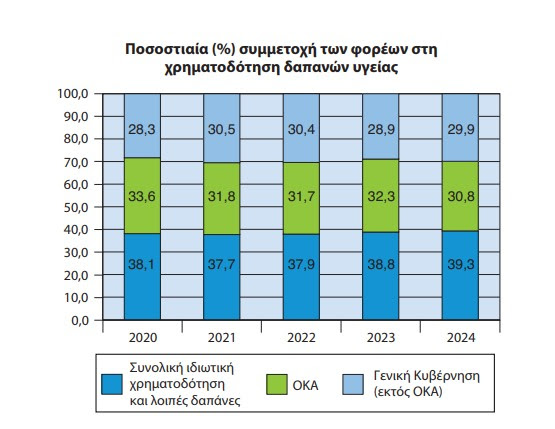 Η αύξηση αυτή μεταφράζεται σε μια σημαντική συμμετοχή της τάξης του 34,2% επί της συνολικής χρηματοδότησης υγείας, καθιστώντας την Ελλάδα μία από τις χώρες με την υψηλότερη ιδιωτική δαπάνη στην Ευρώπη.