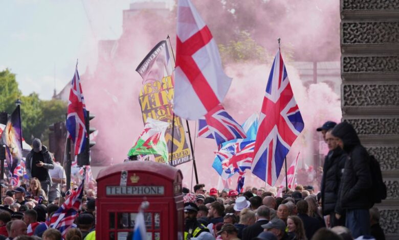 Άνθρωποι διαδηλώνουν κατά τη διάρκεια της πορείας και της συγκέντρωσης «Unite the Kingdom» (Ενώστε το Βασίλειο) υπό την ηγεσία του Tommy Robinson, στο Λονδίνο, το Σάββατο 13 Σεπτεμβρίου 2025.