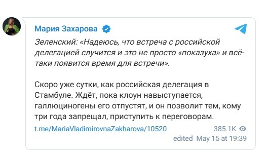 Σε ανάρτησή της στο Telegram, ανέφερε ότι «σύντομα θα είμαστε 24 ώρες από τότε που η ρωσική αντιπροσωπεία έφτασε στην Κωνσταντινούπολη. Περιμένουμε να τελειώσει ο κλόουν την ομιλία του, να περάσει η επίδραση από τα παραισθησιογόνα και να επιτρέψει σε αυτούς που το απαγόρευε εδώ και τρία χρόνια να αρχίσουν διαπραγματεύσεις».