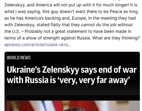 Σε μια ανάρτηση στο Truth Social, ο Τραμπ κοινοποίησε ένα άρθρο του Associated Press στο οποίο ο Ζελένσκι λέει ότι το τέλος του πολέμου είναι «πολύ, πολύ μακριά», με τον Αμερικανό πρόεδρο να σχολιάζει ότι «αυτή είναι η χειρότερη δήλωση που θα μπορούσε να κάνει ο Ζελένσκι».
