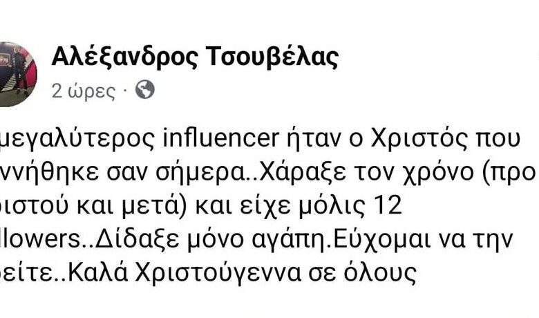 «Ο μεγαλύτερος influencer ήταν ο Χριστός που γεννήθηκε σαν σήμερα… Χάραξε τον χρόνο (προ Χριστού και μετά) και είχε μόλις 12 followers… Δίδαξε μόνο αγάπη. Εύχομαι να τη βρείτε. Καλά Χριστούγεννα σε όλους», είχε γράψει στο Facebook ο Αλέξανδρος Τσουβέλας στην ανάρτηση που έκανε το πρωί της Πέμπτης (25.12.2025).