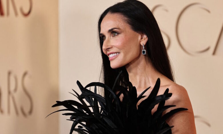 Όπως είδαμε, η Ντέμι Μουρ εμφανίστηκε στο κόκκινο των Όσκαρ με ένα εκθαμβωτικό πράσινο φόρεμα με μαύρα φτερά και λίγα ασημένια κοσμήματα. Τα μακριά μαύρα μαλλιά της ήταν λιτά και χτενισμένα με ένα ελαφρύ ίσιωμα, το οποίο άφηνε τις άκρες των μαλλιών της… ανέμελες.