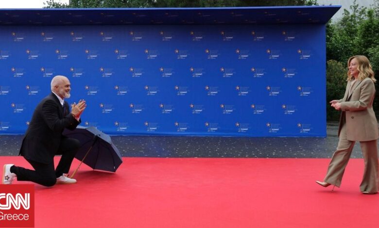 Εξέπληξε η κίνηση του πρωθυπουργού της Αλβανίας Έντι Ράμα, να υποδεχθεί γονατιστός την Τζόρτζια Μελόνι, στη Σύνοδο Κορυφής στα Τίρανα.