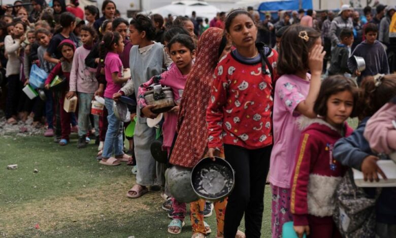 Τα παιδιά κάνουν ουρά για δωρεά φαγητού σε κέντρο διανομής στο Νουσεϊράτ, στην κεντρική Λωρίδα της Γάζας