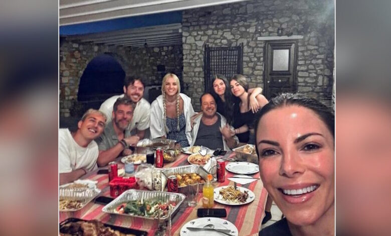 Στη φωτογραφία στην Πάρο ποζάρει και η Αντελίνα Βαρθακούρη, η γυναίκα του Χάρη Βαρθακούρη, η οποία είχε επιμεληθεί όλο το τραπέζι, όπως ανέφερε ο σύζυγός της. Από την παρέα απουσίαζε ο Θανάσης Βαρθακούρης, με τον Χάρη να γράφει με χιούμορ «μας έλειπες».