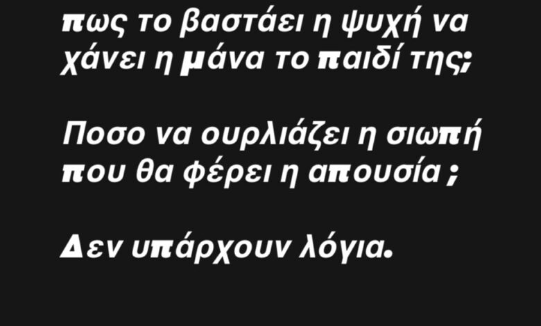 «Πώς ανέχεται; Πώς το βαστάει η ψυχή να χάνει μάνα το παιδί της; Πόσο να ουρλιάζει σιωπή που θα φέρει απουσία; Δεν υπάρχουν λόγια», έγραψε στην ανάρτηση που έκανε, μέσω των stories της, στο Instagram η Ελεονώρα Μελέτη την Παρασκευή.