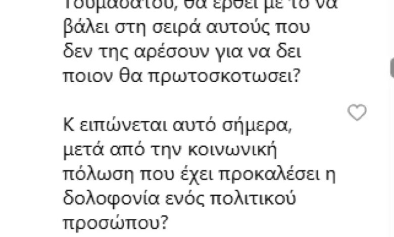 «Η δικαιοσύνη που θέλει και οραματίζεται η κα Τουμασάτου, θα έρθει με το να βάλει στη σειρά αυτούς που δεν της αρέσουν για να δει ποιον θα πρωτοσκοτώσει; Και ειπώνεται αυτό σήμερα, μετά από την κοινωνική πόλωση που έχει προκαλέσει η δολοφονία ενός πολιτικού προσώπου; Το μήνυμα σε όλο αυτό; Και όλα αυτά στο προφίλ ενός κολλεγίου ανθρωπιστικών σπουδών…».