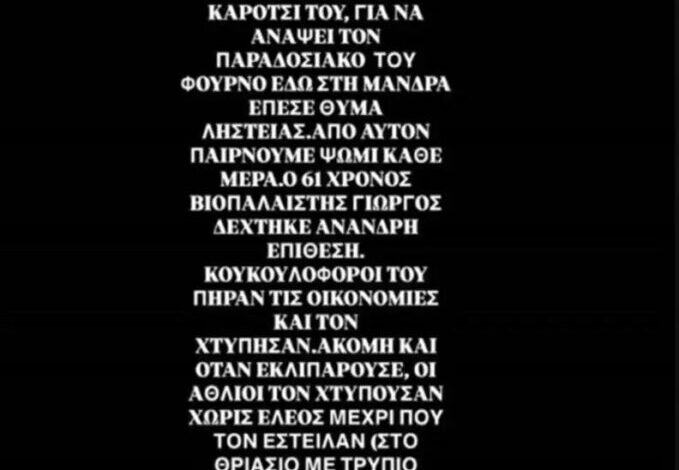 «Είμαι συγκλονισμένη… ο Γιώργος… ο φούρναρης της γειτονιάς μου… ο άνθρωπος που ξεκινά μεσάνυχτα να φορτώσει ξύλα από την αποθήκη του, απέναντι από το σπίτι μου, στο ταλαιπωρημένο καρότσι του για να ανάψει τον παραδοσιακό του φούρνο εδώ στη Μάνδρα, έπεσε θύμα ληστείας.