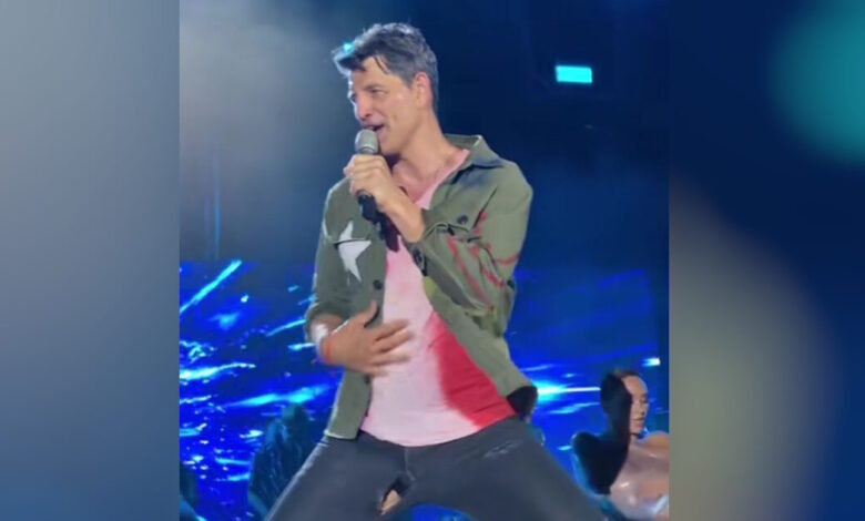 Σε βίντεο που ανέβηκαν στα social media φαίνεται ο τραγουδιστής άνετος να χορεύει ενώ έχει σκιστεί η εσωτερική πλευρά στο δεξί μπατζάκι του παντελονιού του.