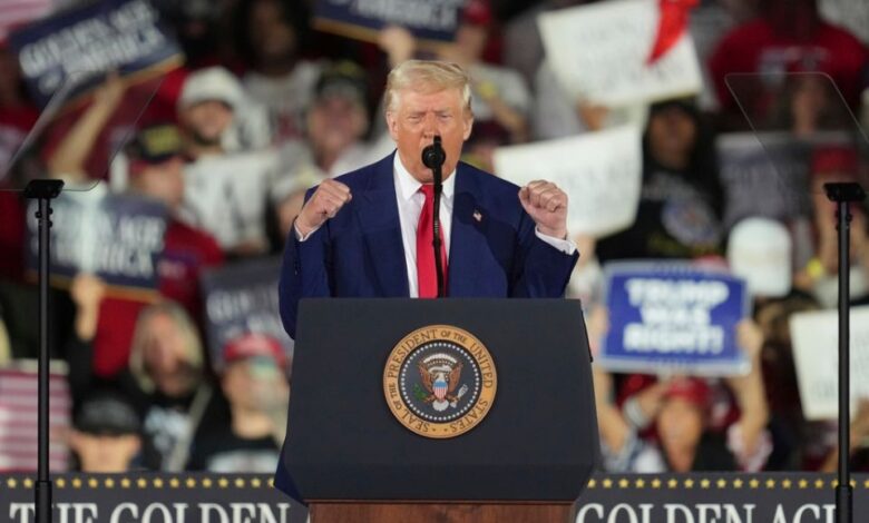 Ο Ντόναλντ Τραμπ κατά τη διάρκεια της ομιλίας του στο Μίτσιγκαν, την Τρίτη 29 Απριλίου 2025.