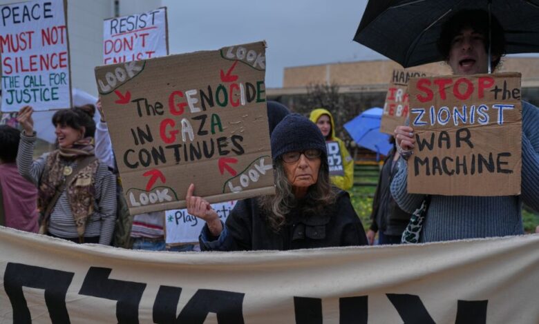 Συγκεκριμένα στο Τελ Αβίβ, διαδηλωτές έβαψαν τα χέρια τους με κόκκινο χρώμα, ενώ ένα από τα πανό που κρατούσαν έγραφαν «σταματήστε τον πόλεμο» και «εμπάργκο όπλων τώρα». Οι διαδηλωτές κρατούσαν επίσης αυτοσχέδια πλακάτ με ποικίλα συνθήματα, όπως «ΗΠΑ και Ισραήλ = ο άξονας του κακού» και «ποιος θα προστατεύσει τους Παλαιστίνιους από την καταπίεση του Ισραήλ;».