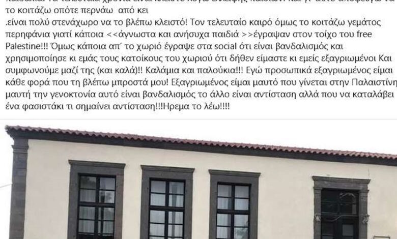 Τον τελευταίο καιρό όμως το κοιτάζω γεμάτος περηφάνια γιατί κάποια “άγνωστα και ανήσυχα παιδιά” έγραψαν στον τοίχο του “Free Palestine!!!”. Όμως κάποια απ’ το χωριό έγραψε στα social ότι είναι βανδαλισμός και χρησιμοποίησε κι εμάς τους κατοίκους του χωριού ότι δήθεν είμαστε κι εμείς εξαγριωμένοι. Και συμφωνούμε μαζί της (και καλά)! Καλάμια και παλούκια!