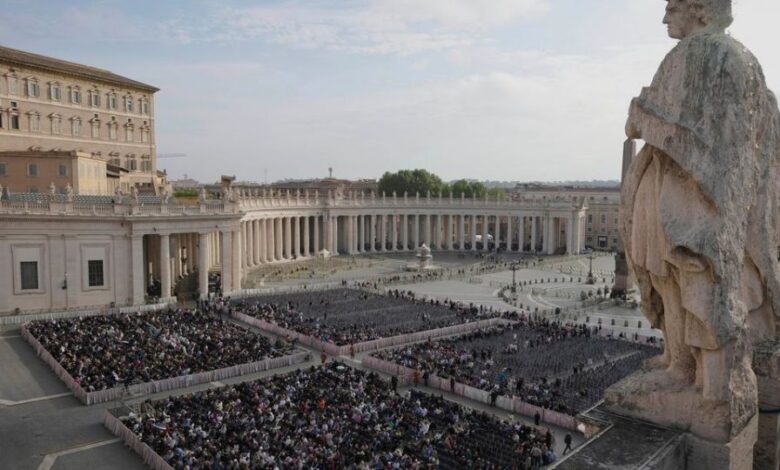 Συγκεντρωμένο πλήθος στην πλατεία του Αγίου Πέτρου περιμένει την άφιξη του σκηνώματος του πάπα Φραγκίσκου.