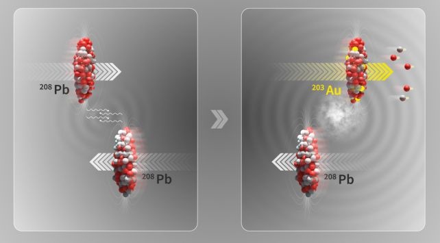 Απεικόνιση πυρήνων μολύβδου (Pb) που συγκρούονται, με τον έναν να χάνει τρία πρωτόνια και να μετατρέπεται σε πυρήνα χρυσού (Au)