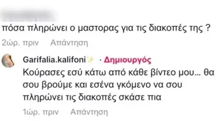 Κάτω από ένα βίντεο που δημοσίευσε στον προσωπικό της λογαριασμό στο TikTok, μέσω του οποίου θέλησε να στείλει ένα μήνυμα σε κάποιο πρόσωπο που βρισκόταν στη ζωή της στο παρελθόν ένας hater τη ρώτησε πόσα χρήματα δίνει ο Χρήστος Μάστορας για τις διακοπές της.