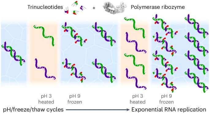 Έπειτα, με την απόψυξή τους και την επανάληψη του κύκλου, οι αλλαγές στο pH και τη θερμοκρασία που θα μπορούσαν να συμβούν στη φύση επέτρεψαν στο RNA να αναπαράγεται συνεχώς με αυτούς τους κλώνους για αρκετό χρόνο ώστε να έχει βιολογική λειτουργία και να διαδραματίσει ρόλο στην προέλευση της ζωής.