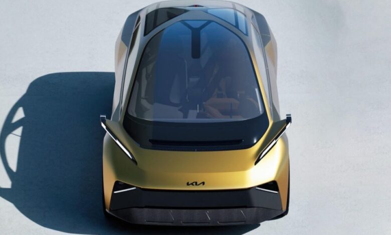 Γενικώς στο εσωτερικό, η Kia υιοθετεί μια ακραία μινιμαλιστική προσέγγιση, ποντάροντας στην τεχνολογία ως βασικό στοιχείο εμπειρίας. Ένα 3D Ηead-up Display αντικαθιστά τον παραδοσιακό πίνακα οργάνων, ενώ ολογραφικές ενδείξεις, ένα yoke αντί για κλασικό τιμόνι και ένας πλευρικό χειριστήριο άγνωστης προς το παρόν λειτουργίας συνθέτουν ένα περιβάλλον που παραπέμπει σε ένα concept τεχνολογίας παρά σε αυτοκίνητο.