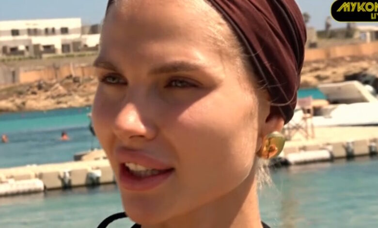 Σε ερώτηση για το αν της αρέσει η Μύκονος, αρκέστηκε να απαντήσει «Έτσι κι έτσι». Πρόσθεσε πως ήρθε με την παρέα της για δυο μέρες στο νησί.