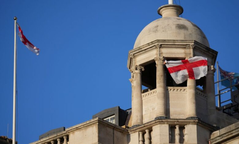 Η σημαία της Αγγλίας εμφανίζεται κατά τη διάρκεια της πορείας και της συγκέντρωσης Unite the Kingdom υπό την ηγεσία του Tommy Robinson κοντά στο Westminster.