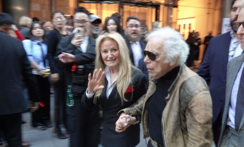 Ο θρυλικός σχεδιαστής Ραλφ Λόρεν, φορώντας τα μεγάλα του μαύρα γυαλιά, δεν άφηνε το χέρι της συζύγου του που τον βοηθούσε να σταθεροποιήσει το βήμα του.
